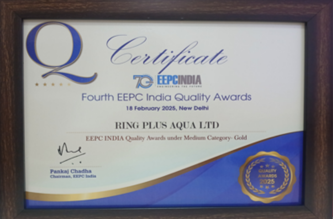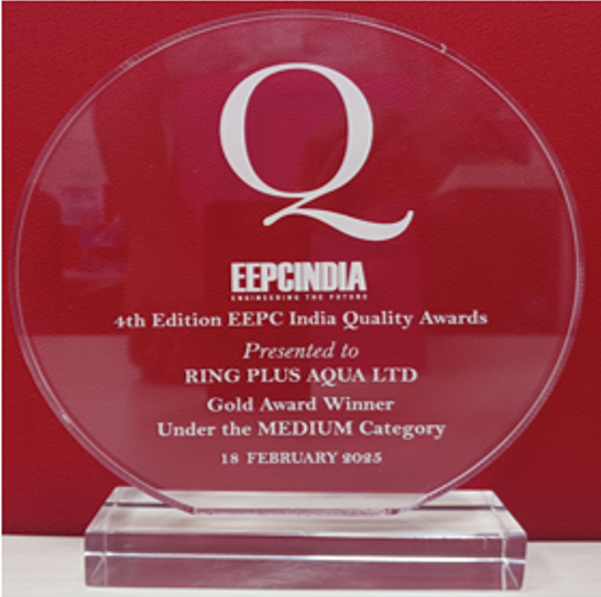 We are proud to announce that Ring Plus Aqua Ltd. (Now JKMPTL) has been honored with the prestigious Gold Award at the 4th Edition of the EEPC India Quality Awards, under the Medium Organization Category. This national recognition by EEPC India (Engineering Export Promotion Council) celebrates our unwavering commitment to quality excellence, global competitiveness, and best-in-class manufacturing practices. The award is a testament to our robust systems, continuous improvement culture, and customer-first mindset that guide our export quality initiatives. Receiving this accolade among India's most respected engineering exporters underscores our relentless pursuit of precision, consistency, and innovation across global markets.