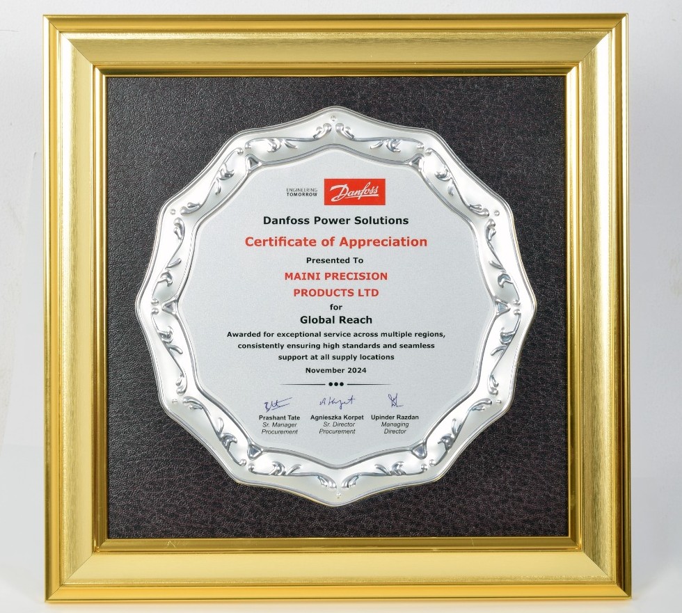 We are proud to share that Maini Precision Products Ltd. (Now JKMPTL) received a Certificate of Appreciation from Danfoss Power Solutions for Global Reach.